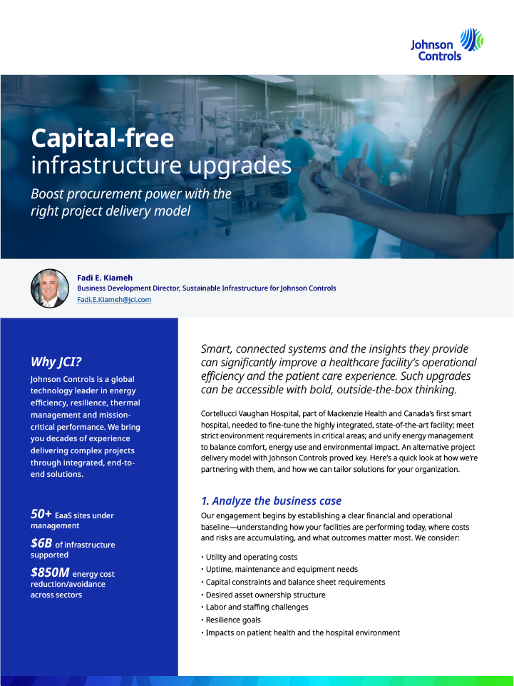 See how leading healthcare organizations are partnering with Johnson Controls on alternative project delivery models—improving facilities while protecting the balance sheet. Read the article for a look at Energy as a Service, public-private partnerships, and savings-based options.