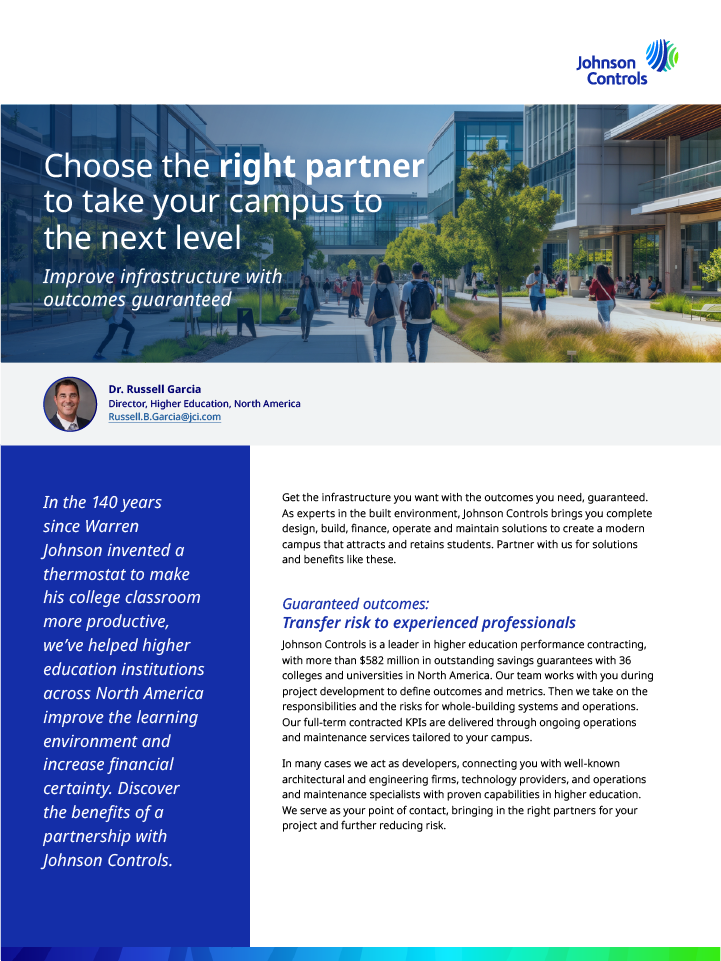 See how you can use ever-evolving technology and innovative financing options to modernize your campus, operate more efficiently and meet student expectations for sustainability.