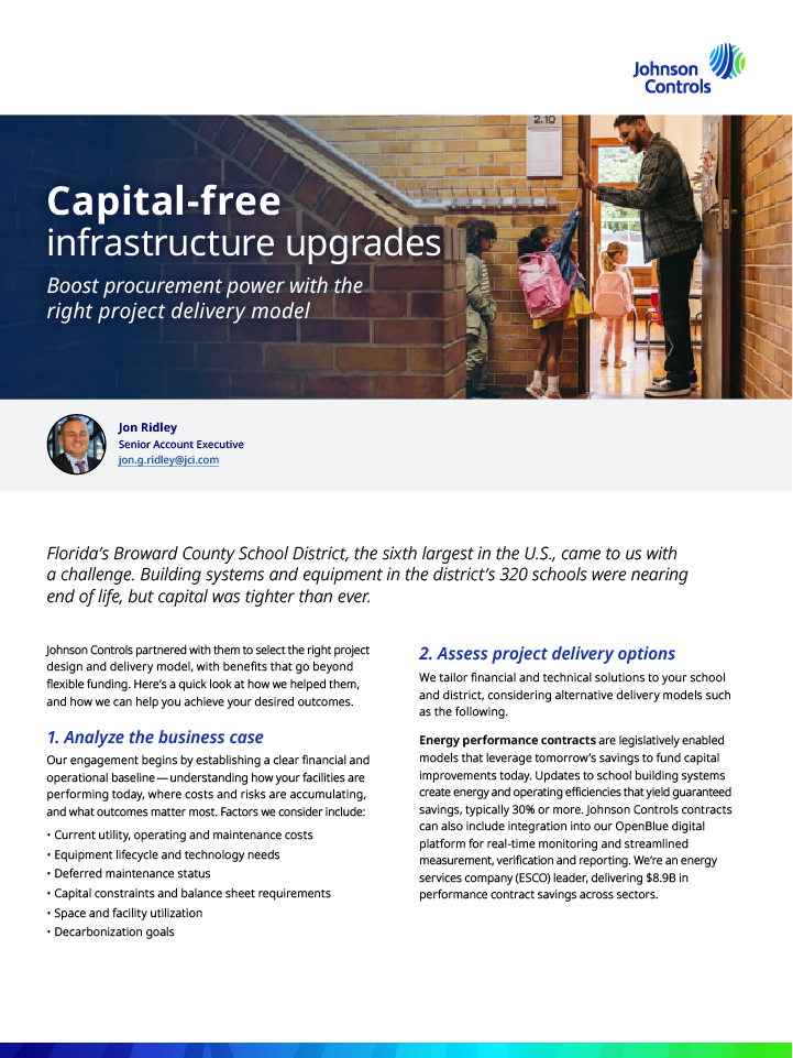See how school districts are partnering with Johnson Controls on alternative project delivery models—improving facilities while protecting the balance sheet. Read the article for a look at energy performance contracts, Energy as a Service, and public-private partnerships.
