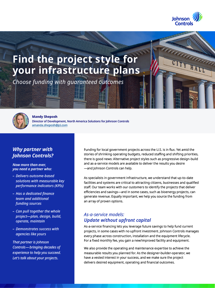 Move ahead confidently with infrastructure upgrades that enhance efficiency and support economic vibrancy. See how Johnson Controls helps you find the project style and funding solutions that fit your scope, budget and balance sheet needs.